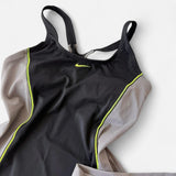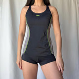 Vintage Nike two-piece: grey colorblock racerback tank with neon-yellow piping paired with matching black compression shorts.Material: Performance stretch. Condition: Excellent vintage. Fit: DM for measurements.Pre-loved. One of one.